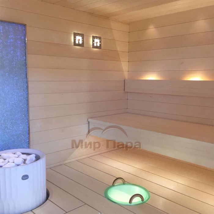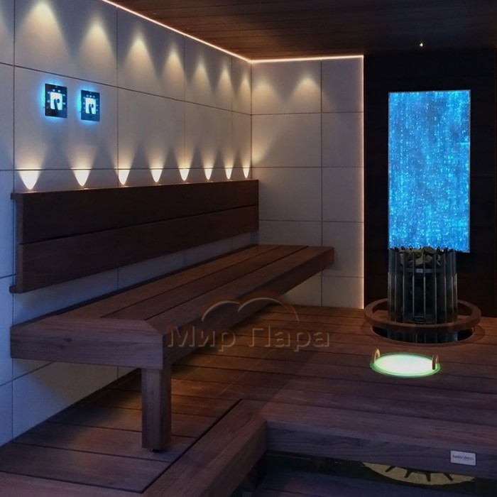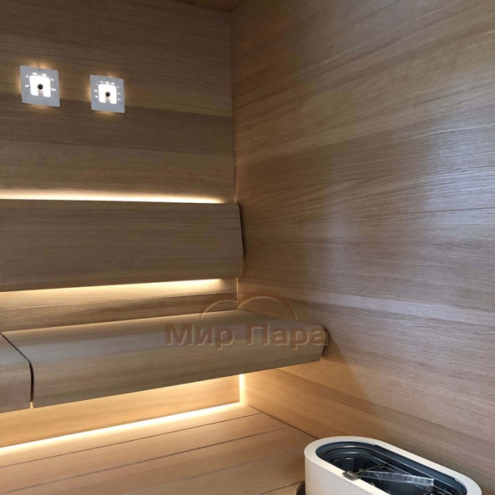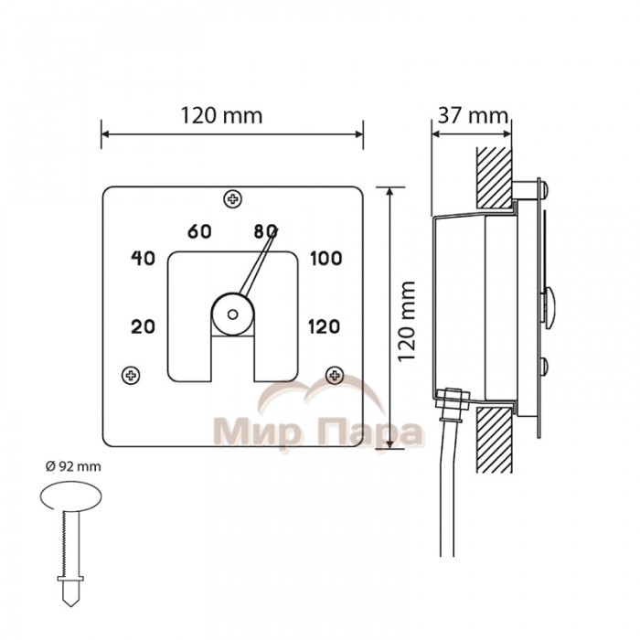 Подсветка гигрометра реализуется одним оптоволокном диаметром 2–4 мм или светодиодным кабелем, благодаря чему шкала остается хорошо читаемой даже в мягком полумраке. Прибор устанавливается на этапе обшивки сауны: глубина ниши для монтажа составляет 40 мм, а над поверхностью обшивки гигрометр выступает всего на 20 мм, создавая аккуратный «встроенный» вид. Крепление к стене выполняется тремя винтами из нержавеющей стали, входящими в комплект.