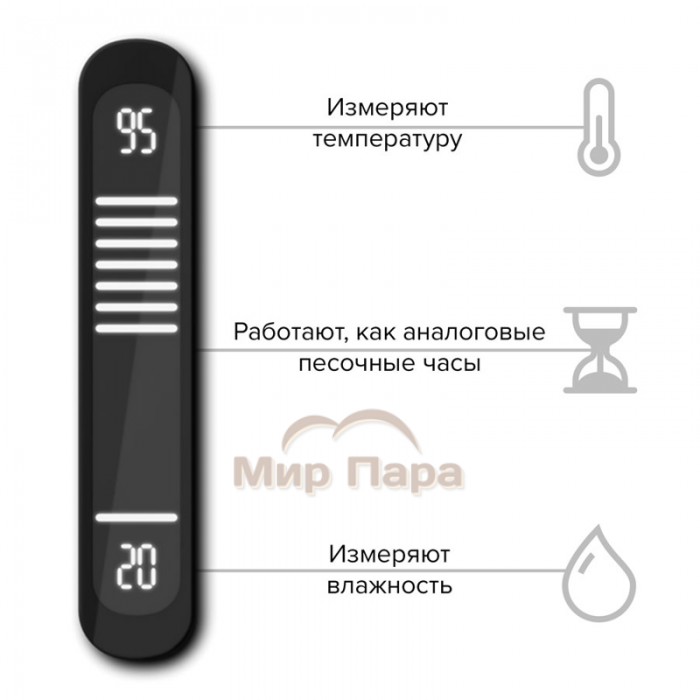 Песочные часы с термометром‑гигрометром Licht-2000 FLIP — это стильный и функциональный прибор для сауны, который совмещает классический таймер и цифровую индикацию параметров микроклимата. Чтобы запустить отсчет времени, достаточно перевернуть верхнюю панель на 180 градусов, как у обычных песочных часов.
