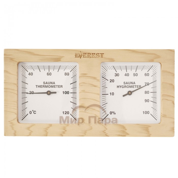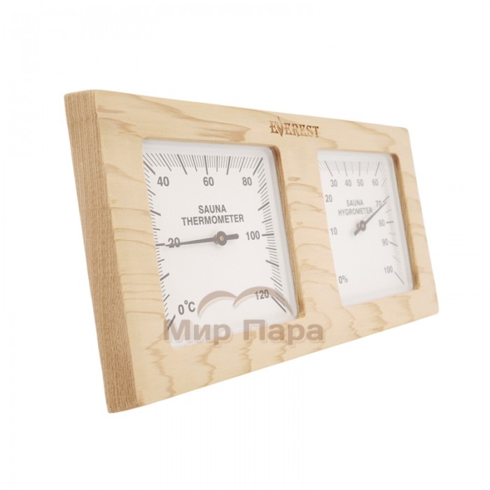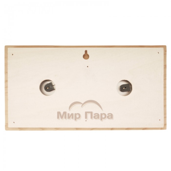Корпус выполнен из натурального кедра, устойчивого к высокой влажности и температуре, а светлое (white) оформление шкал делает показания хорошо читаемыми. Горизонтальное исполнение удобно для размещения над полками или на стене, а лаконичный дизайн гармонично вписывается в интерьер деревянной бани или сауны.