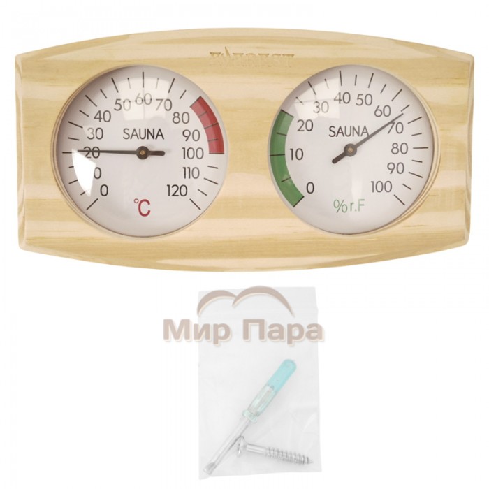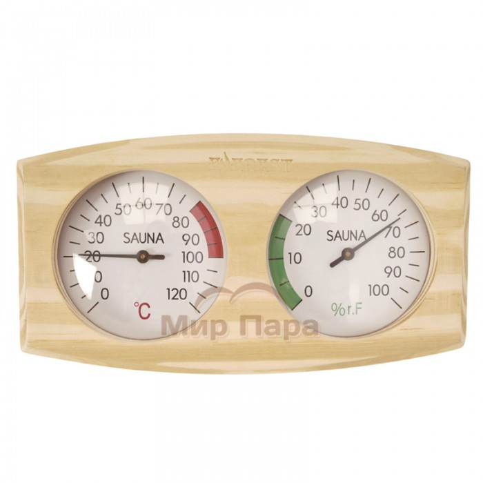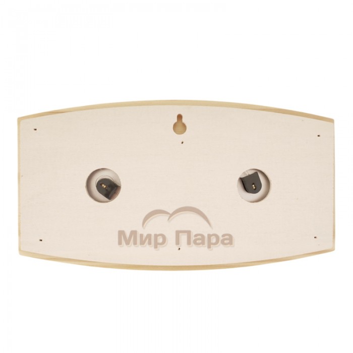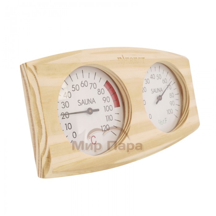 Корпус выполнен из натуральной сосны, что придает изделию теплый, уютный вид и хорошо сочетается с традиционной деревянной отделкой парилки. Прибор объединяет шкалы термометра и гигрометра, что позволяет на одном устройстве контролировать основные параметры воздуха и вовремя корректировать режим парения.
