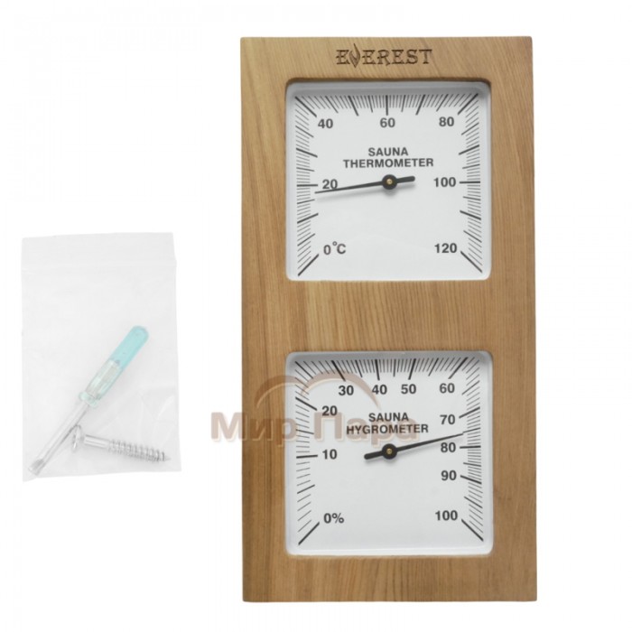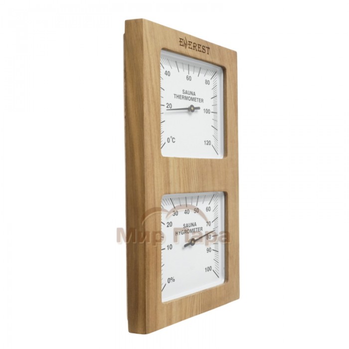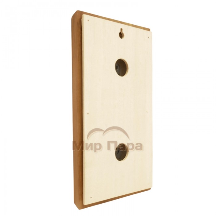 Корпус выполнен из натурального кедра, устойчивого к высоким температурам и влаге, с светлым (white) оформлением, которое хорошо сочетается с отделкой парилки. Вертикальная форма делает прибор компактным и удобным для размещения на стене, а наглядные шкалы обеспечивают хорошую читаемость показаний даже с расстояния.