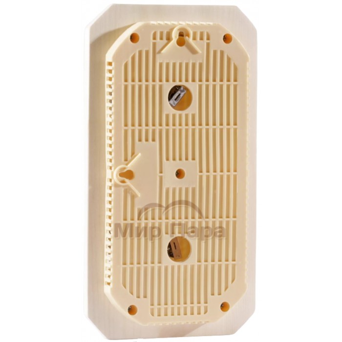 Термогигрометр SAWO 221-THVA имеет оригинальную прямоугольную форму с фигурными углами. Ориентация прибора вертикальная. В широкой рамке из древесины осины находится два круглых окошка. Под стеклом каждого окошка расположен графичный циферблат. Один из них - это гигрометр, который с точностью измерит уровень влажности в парной, другой - термометр, который сообщит о температуре воздуха. Данный прибор прекрасно подойдёт для использования в любом парильном помещении.