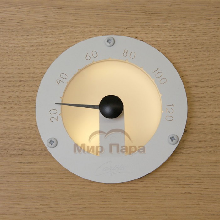 Термометр для сауны Cariitti белый — элегантный круглый прибор для контроля температуры в парной с эффектной декоративной подсветкой. Он выполнен из матового стекла и нержавеющей стали, устойчивых к высокой температуре и влажности, и гармонично вписывается в современный интерьер сауны.