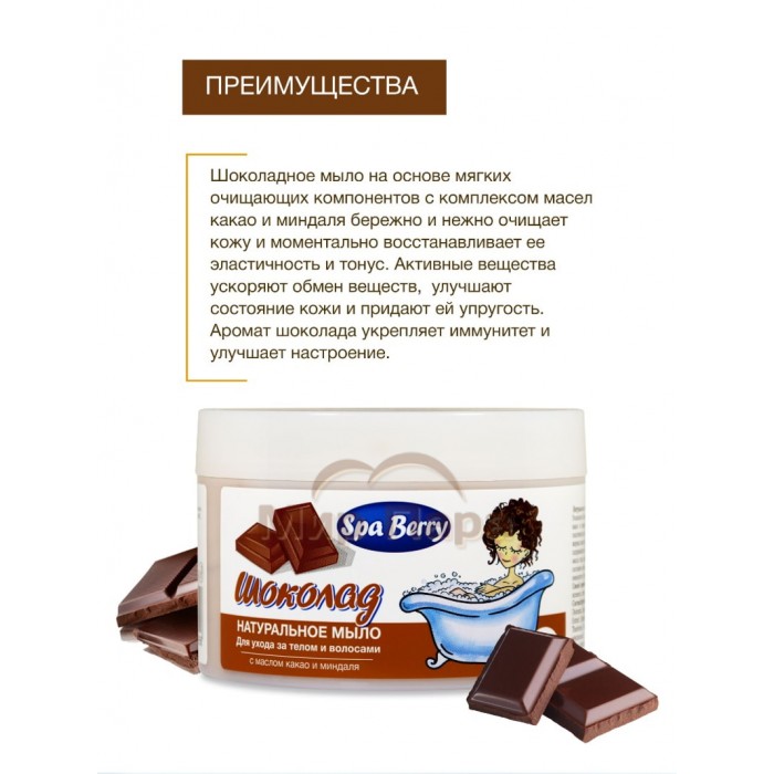 Шоколадное мыло на основе мягких очищающих компонентов с комплексом масел какао и миндаля бережно и нежно очищает кожу и моментально восстанавливает ее эластичность и тонус. Масло миндаля, благодаря содержанию полезных липидов и незаменимых жирных кислот, витаминов B2 и Е, увлажняет, питает и смягчает кожу. Активные вещества, содержащиеся в какао-бобах, значительно ускоряют обмен веществ и способствуют снижению массы тела; непревзойденно выводят из организма токсины и лишнюю жидкость, улучшают состояние кожи и придают ей упругость. А соблазнительный аромат шоколада укрепляет иммунитет и улучшает настроение.