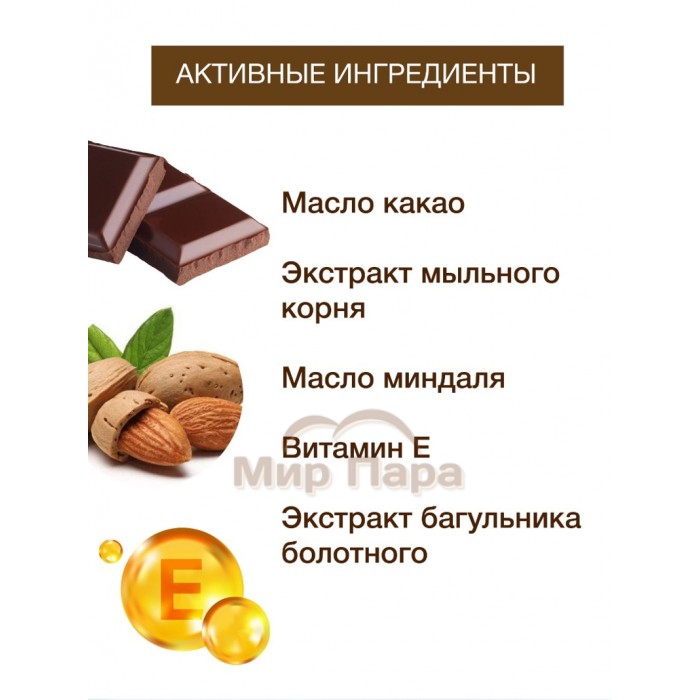 Состав: Aqua, Sodium Laureth Sulfate, Sucrose, Cocamide DEA, Glycol Distearate, Saponaria Officinalis Root Extract (Экстракт мыльного корня), Humulus Lupulus Extract (Экстракт хмеля), Ledum Palustre Extract (Экстракт багульника болотного), Theobroma Cacao Seed Butter (Масло какао), Prunus Amygdalus Dulcis Oil (Масло миндальное),Tocopheryl Acetate (Витамин Е), Niacinamide (Витамин В),Citric Acid, Parfum, Benzoic Acid, Sorbic Acid, Dehydroacetic Acid, Benzyl alcohol, Caramel, CI 20285.