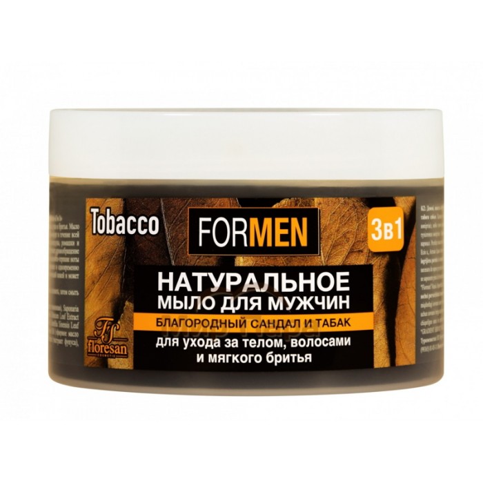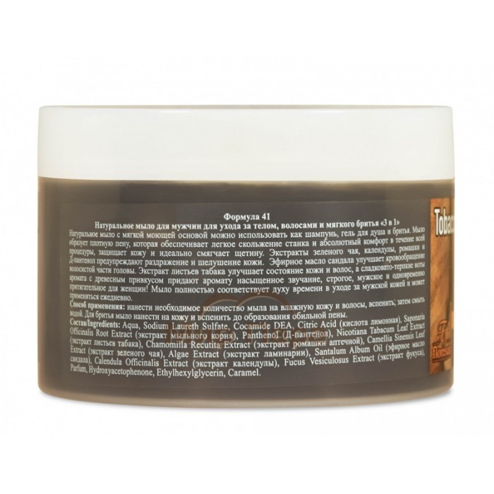 Натуральное мыло с мягкой моющей основой можно использовать как шампунь, гель для душа и бритья. Мыло образует плотную пену, которая обеспечивает легкое скольжение станка и абсолютный комфорт в течение всей процедуры, защищает кожу и идеально смягчает щетину. Экстракты зеленого чая, календулы, ромашки и Д-пантенол предупреждают раздражение и шелушение кожи. Эфирное масло сандала улучшает кровообращение волосистой части головы. Экстракт листьев табака улучшает состояние кожи и волос, а сладковато-терпкие ноты аромата с древесным привкусом придают аромату насыщенное звучание, строгое, мужское и одновременно притягательное для женщин!