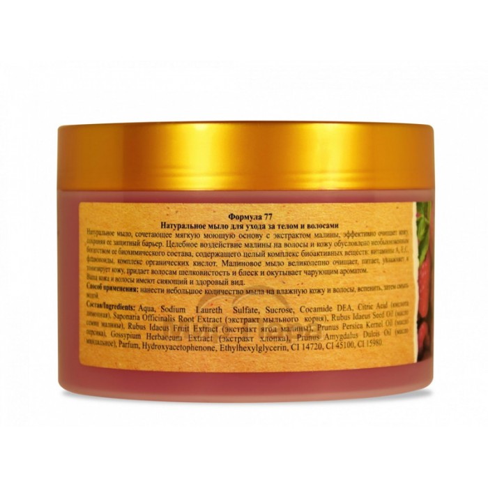 Натуральное мыло, сочетающее мягкую моющую основу с экстрактом малины, эффективно очищает кожу, сохраняя ее защитный барьер. Целебное воздействие малины на волосы и кожу обусловлено необыкновенным богатством ее биохимического состава, содержащего целый комплекс биоактивных веществ: витамины А, Е,С, флавоноиды, комплекс органических кислот.