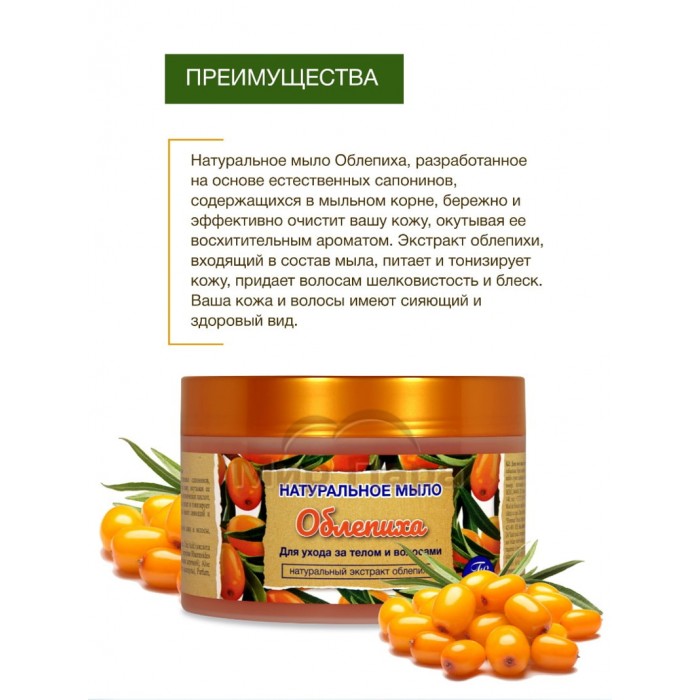 Натуральное мыло облепиха, разработанное на основе естественных сапонинов, содержащихся в мыльном корне, бережно и эффективно очистит вашу кожу, окутывая ее восхитительным ароматом. Облепиха — это настоящий кладезь витаминов, органических кислот, белков и микроэлементов. Экстракт облепихи, входящий в состав мыла, питает и тонизирует кожу, придает волосам шелковистость и блеск. Ваша кожа и волосы имеют сияющий и здоровый вид.