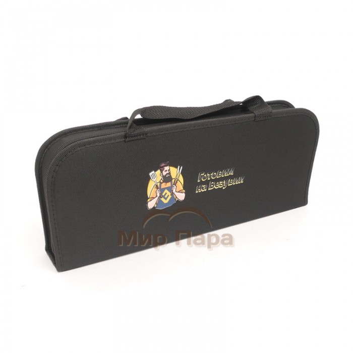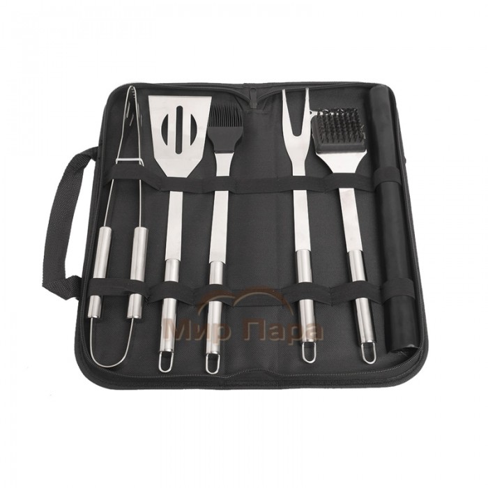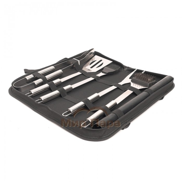 Набор для работы с грилем и барбекю, состоящий из 6 предметов. Аксессуары размещены в тканевом пенале с боковыми пластиковыми вставками. Чехол чёрного цвета закрывается на застёжку-молнию.