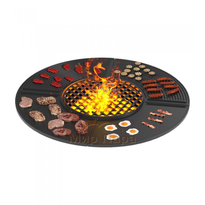 Небольшой бортик по краю плиты ограничивает рабочее пространство, предотвращает попадание жира в огонь и его возгорание. В середине плиты размещена чугунная решётка Везувий Стейк. Эта решётка предназначена для готовки мяса и овощей с красивым диагональным рисунком. Большая теплоёмкость чугуна позволяет быстро приготовить на очаге мясо, рыбу, овощи, грибы и другие продукты в различных вариациях.