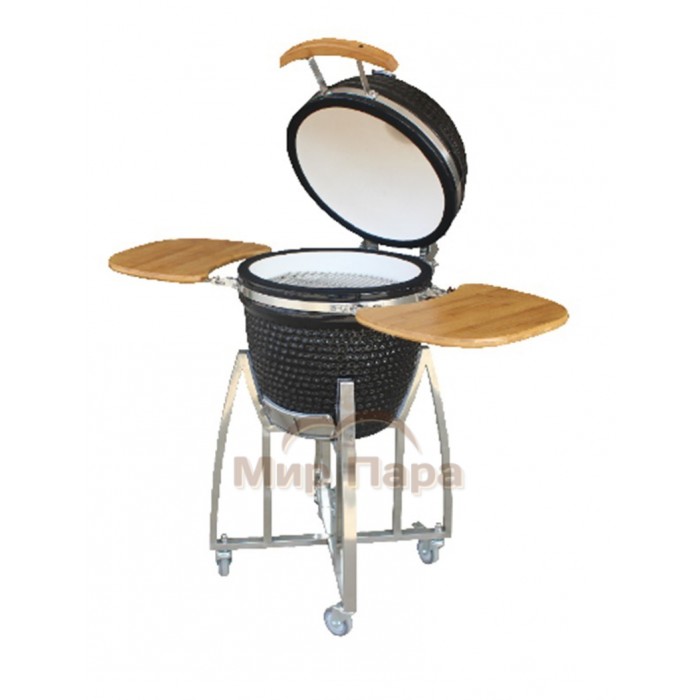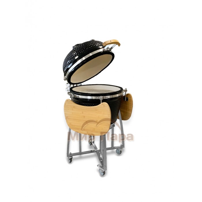 Верхняя крышка гриля открывается с помощью ручки из бамбука, расположенной на передней поверхности керамического гриля.
