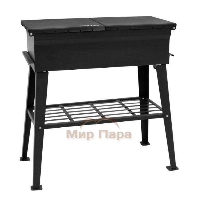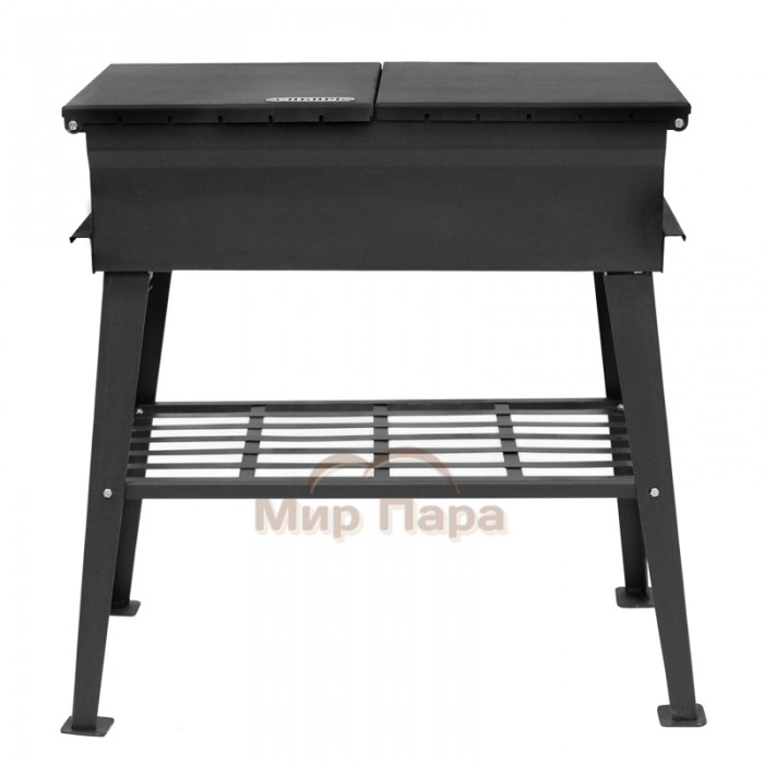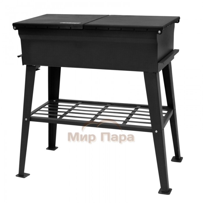 Характерной отличительной особенностью данного мангала является то, что он имеет две крышки, выполняющие функцию закрытия мангальной части, а также подставок под решетку, шампуры либо посуду, необходимую при приготовлении. Это делает использование мангала очень практичным и эффективным: не нужно подбирать место под аксессуары, продукты и сопутствующие элементы барбекю.
