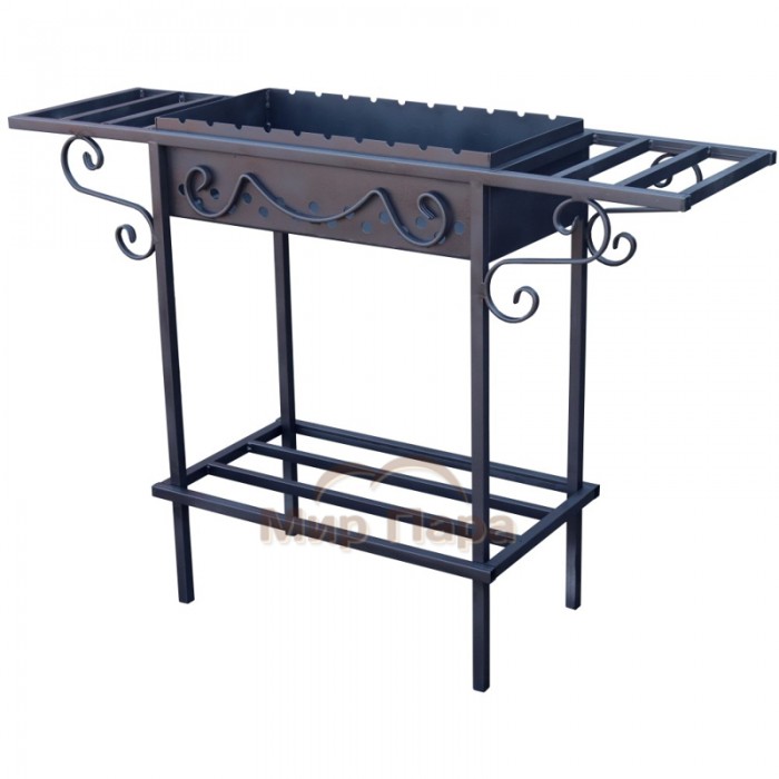 Мангал выполнен из профильной трубы сечением 20х20 мм и оснащен стальной чашей толщиной 3 мм, что обеспечивает прочность и долговечность конструкции. Поверхность покрыта термостойкой краской, которая защищает металл от воздействия высоких температур и продлевает срок службы изделия. По бокам предусмотрены удобные мини-столики, на которых можно разместить мясо, специи, посуду или готовые шашлыки. В нижней части конструкции оборудована поленница для удобного хранения дров и растопки.