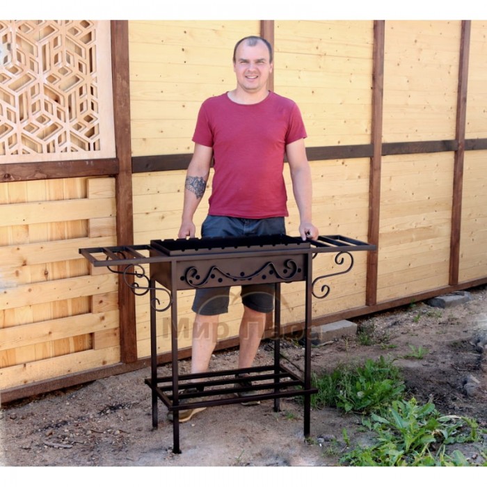 Габариты мангала составляют 1200х340х850 мм, размер чаши — 600х300х170 мм. Толщина металла жаровни — 3 мм. Благодаря компактным размерам и продуманной конструкции мангал удобно использовать на участке и легко вписать в зону отдыха.