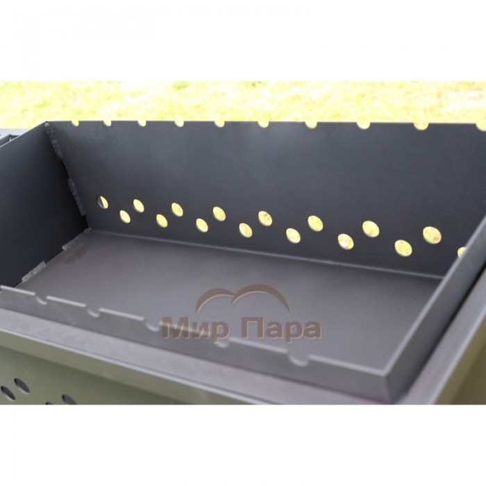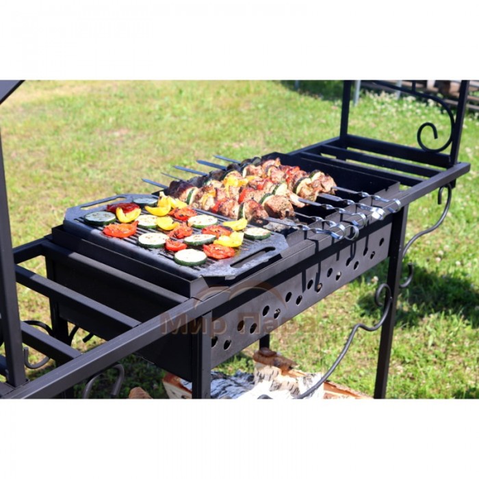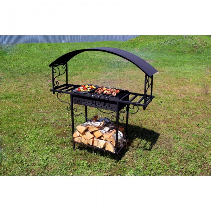 По бокам расположены удобные мини-столики, на которых можно разместить мясо, специи, посуду или уже готовые шашлыки. В нижней части конструкции оборудована поленница для хранения дров и растопки, что делает использование мангала еще более практичным. Габариты мангала составляют 1200х450х850/1550 мм, размер чаши — 600х300х170 мм. Толщина металла жаровни — 2 мм, толщина профиля корпуса мангала — 2 мм.