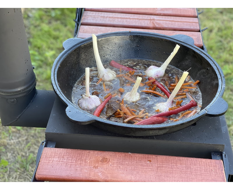 Но как быть, если душа жаждет разнообразия – сегодня плова, а завтра шашлыка? Специально для таких гурманов существуют кулинарные комбайны – мангалы с пристроенной к ним печью для казана. Приготовили блюдо в казане, а получившиеся угли пригодятся для запекания мяса на решетке для гриля. Или наоборот, оставшиеся от шашлыка угли пойдут на разогрев казана. И выходные дни на свежем воздухе становятся непрекращающимся праздником.