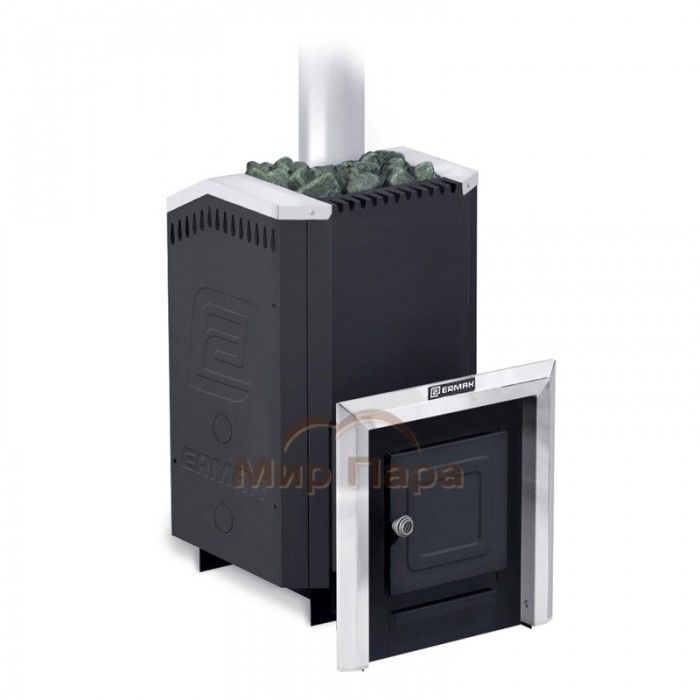 Элементы декора, накладки, портал топки выполнены из жаростойкой хромированной нержавеющей стали INOX AISI-430. Все наружные стальные элементы корпуса печи, топочный канал, каменка и кожух окрашены качественной жаропрочной износостойкой кремнийорганической краской черного матового цвета.