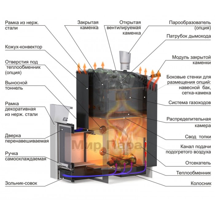 - Модульность — возможность усовершенствования печи с помощью дополнительных опций (навесной бак, сетка-каменка, модуль закрытой каменки, парообразователь, выносной бак, теплообменник, конвектор или экономайзер на трубу дымохода и др.).