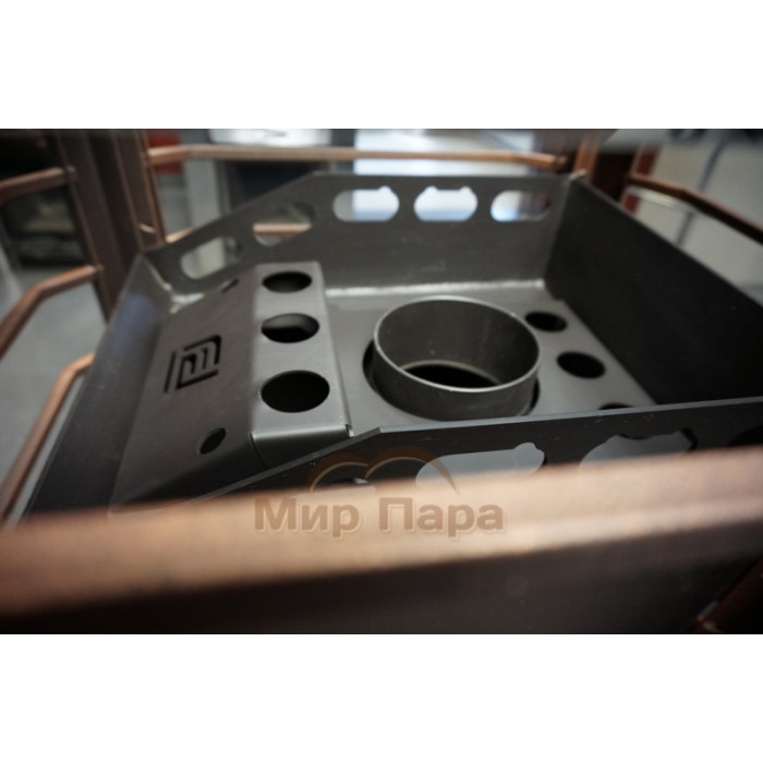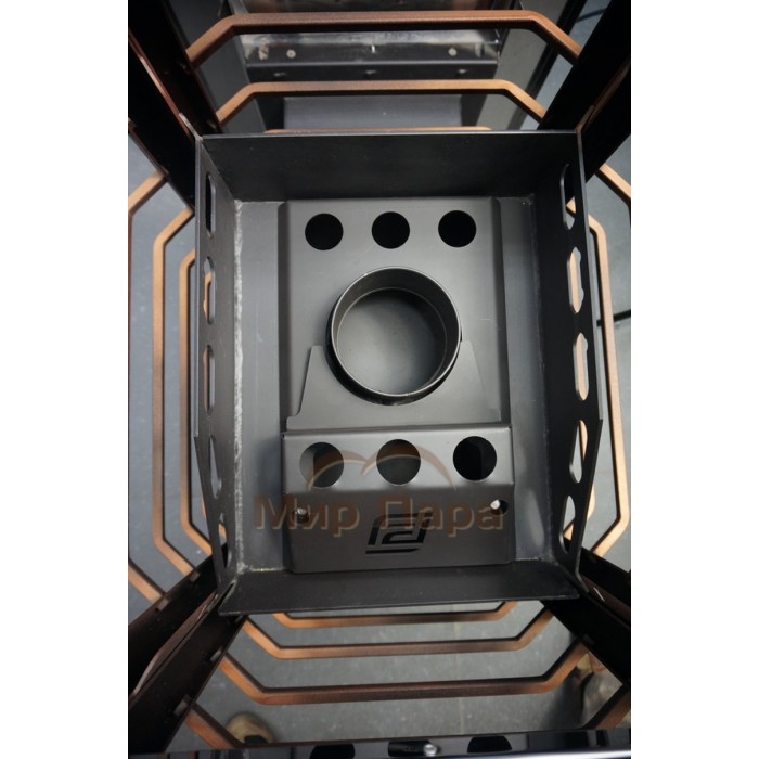Стальной модуль закрытой каменки закрывает камни сверху, создавая эффект "термоса" и способствуя повышению температуры камней внутри. Внутри модуля камни нагреваются до более высоких температур, что позволяет получать более легкий мелкодисперсный пар.