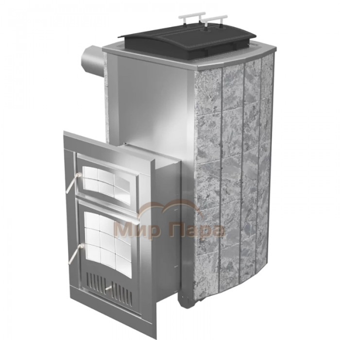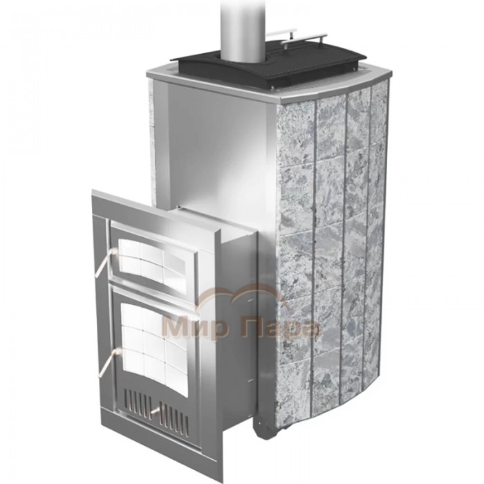 Дровяная печь VVD «Чародейка М Русский пар» в каменной облицовке — компактная «мини»‑версия флагманской печи «Чародейка», рассчитанная на парные объемом 10-20 м3 и ориентированная на любителей мягкого классического русского пара. Топочный агрегат выполнен из коррозионностойкой жаропрочной нержавеющей стали AISI 439 толщиной 4 мм, в версии PRO — из аустенитной стали AISI 304, что обеспечивает высокий ресурс, устойчивость к перегревам и соответствие требованиям к печному оборудованию.