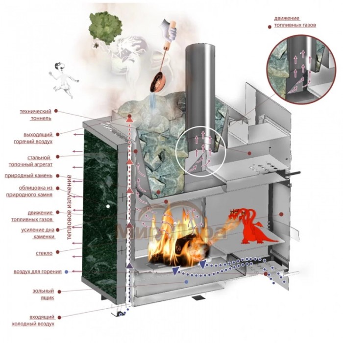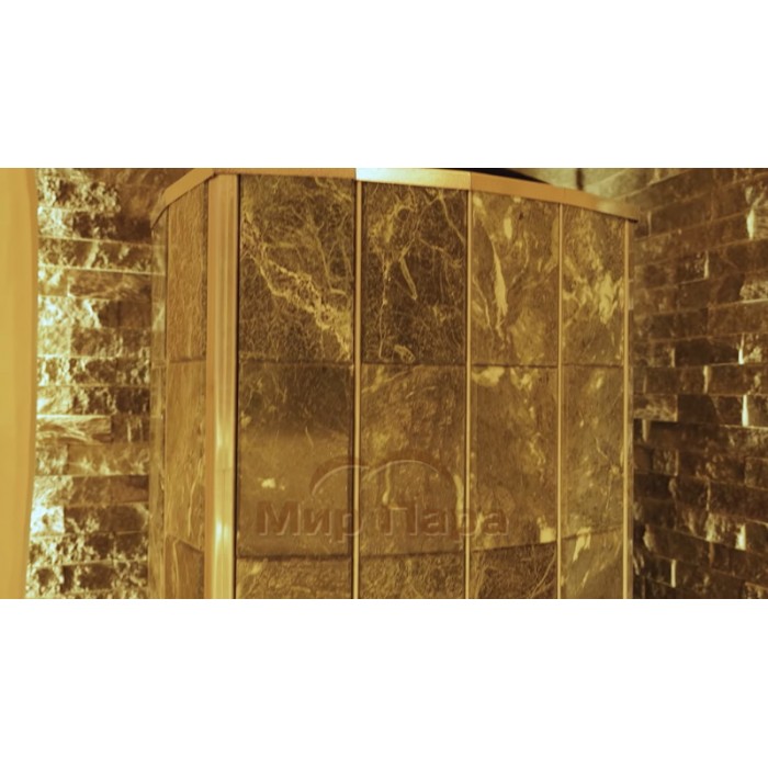 Облицовка из натурального талькохлорита превращает жесткое тепловое излучение от раскаленной топки в более мягкое и комфортное, а за счет большой массы каменный корпус аккумулирует значительное количество тепла и затем медленно его отдает, поддерживая стабильную температуру в парной почти без дополнительного подтапливания.