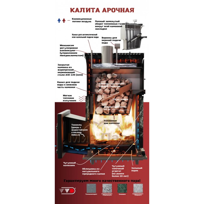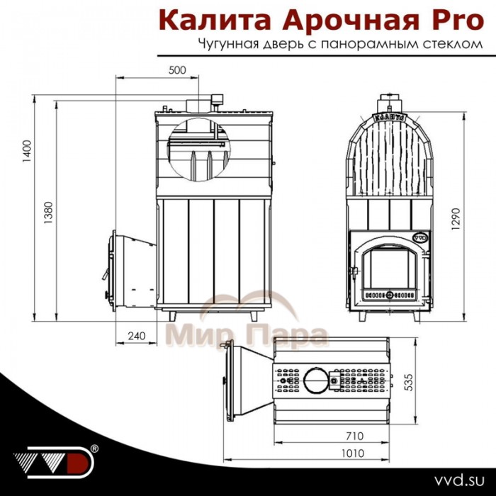 Печь Калита Арочная Pro выделяется среди печей модельного ряда «Калита» оригинальным дизайном, решенном в традиционном русском стиле и отличными тепловыми и эксплуатационными характеристиками.