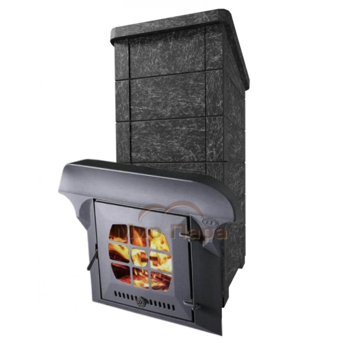 Суммарная масса печи составляет около 800 кг (топочный агрегат, облицовка, закладка камней в каменку), что обеспечивает очень высокую теплоаккумулирующую способность этой модели.