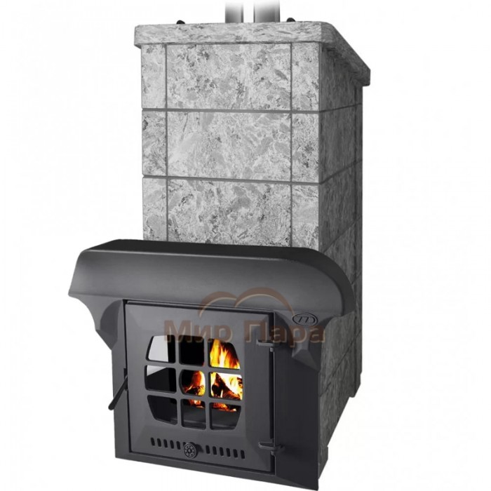 Суммарная масса печи составляет около 800 кг (топочный агрегат, облицовка, закладка камней в каменку), что обеспечивает очень высокую теплоаккумулирующую способность этой модели.