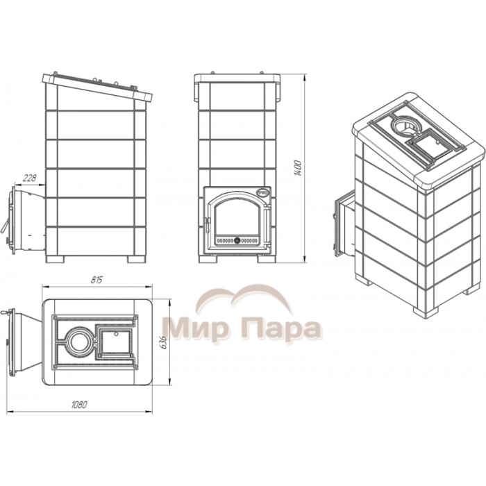 Суммарная масса печи составляет около 800 кг (топочный агрегат, облицовка, закладка камней в каменку), что обеспечивает очень высокую теплоаккумулирующую способность этой модели.