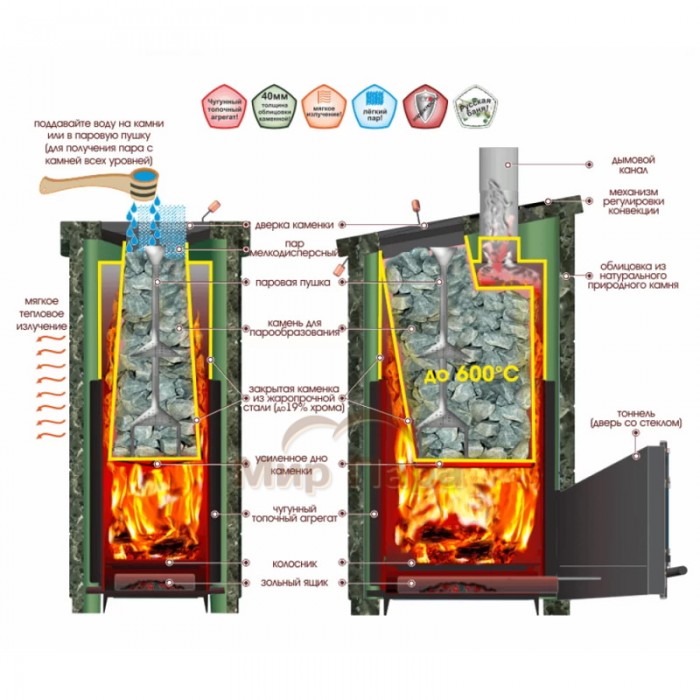 - облицовка из натурального камня позволяет преобразовать жесткое тепловое излучение от раскаленного топочного агрегата в более мягкое, сделать его комфортным и приятным большая масса печи способна накапливать значительное количество тепла, а затем медленно отдавать его, поддерживая стабильную температуру в парном помещении без дополнительного подтапливания печи.