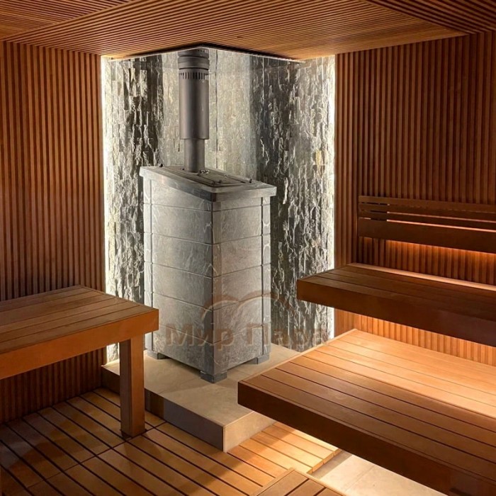 - уникальная встроенная в объем топки каменка с вертикальной загрузкой, выполненная из жаропрочной коррозионностойкой стали AISI 439, вмещает до 200 кг камней и обеспечивает возможность получения большего объема пара;