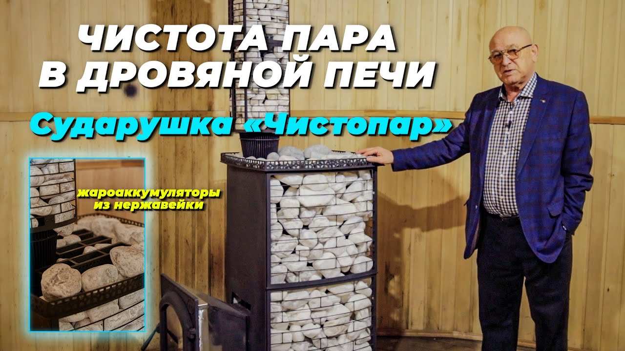 Печь ВВД Сударушка «ЧистоПар» с чугунной дверцей со стеклом — мощная чугунная банная печь с увеличенной каменкой и системой «ЧистоПар» для получения мелкодисперсного мягкого пара в парной объемом 10–18 м3.