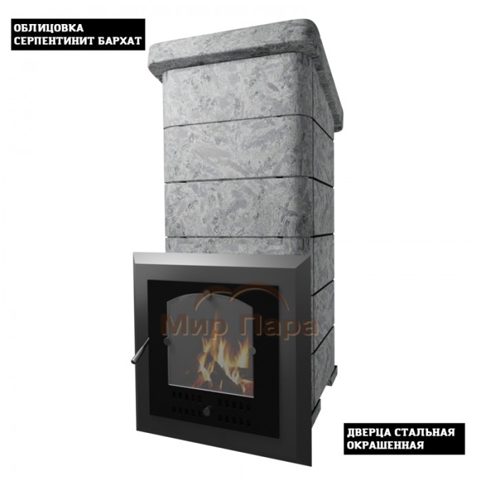 Увеличенная каменка с вертикальной загрузкой камней и 100%-м охватом ее поверхности пламенем обеспечивает прогрев камней до очень высоких температур. Благодаря этому печь дает мелкодисперсный «легкий» пар, комфортный даже при интенсивном режиме парения. Массивная облицовка Серпентинит Бархат не только придает печи солидный внешний вид, но и работает как большой аккумулятор тепла: баня прогревается равномерно, без жесткого перегрева воздуха. Конструкция предусматривает использование чугунного механизма регулировки конвекции (опция, приобретается отдельно), что позволяет тонко настраивать тепловой режим в парной – от более быстрого конвекционного прогрева до мягкого длительного излучения через камень. Дверь стальная со стеклом дает возможность наблюдать за огнем, создавая в парной атмосферу живого костра.