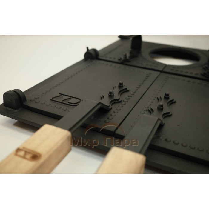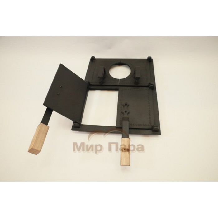 В комплект поставки входит чугунно перекрытие с дверцами и стальная монтажная рамка, которая обеспечивает правильную и надежную установку узла при самостоятельном обустройстве печи. Такое решение упрощает монтаж, улучшает внешний вид верхней части печи и повышает общую эффективность ее работы за счет управляемого распределения тепла.