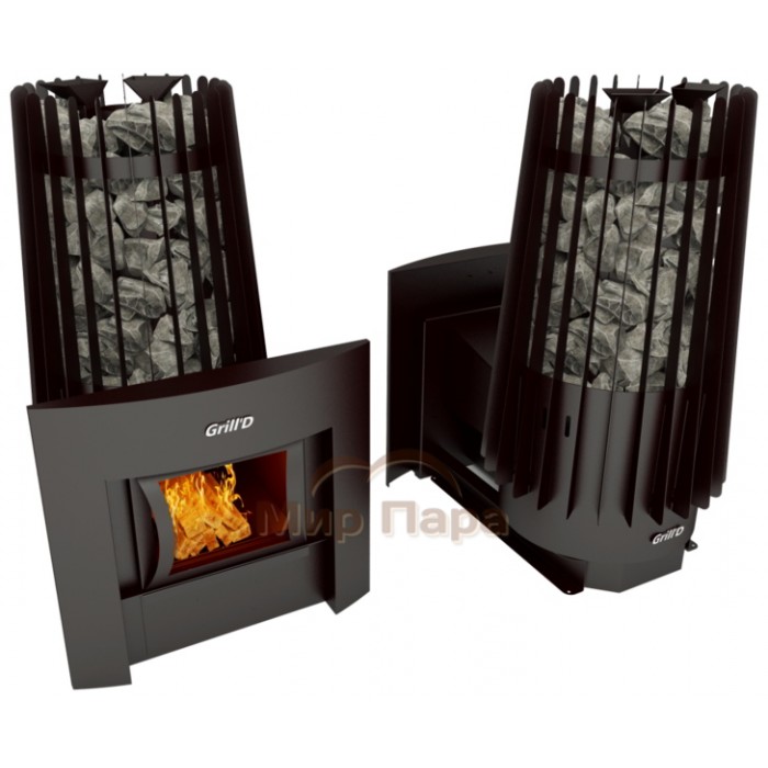 Эта модель печи может комплектоваться теплообменником, усилением камеры горения, сеткой с камнями на дымоход, декоративными экранами. Металлические ламели сетки для камней можно заменить на каменные в любое время.
