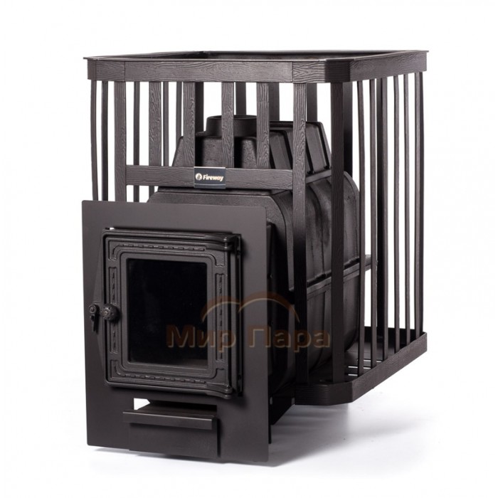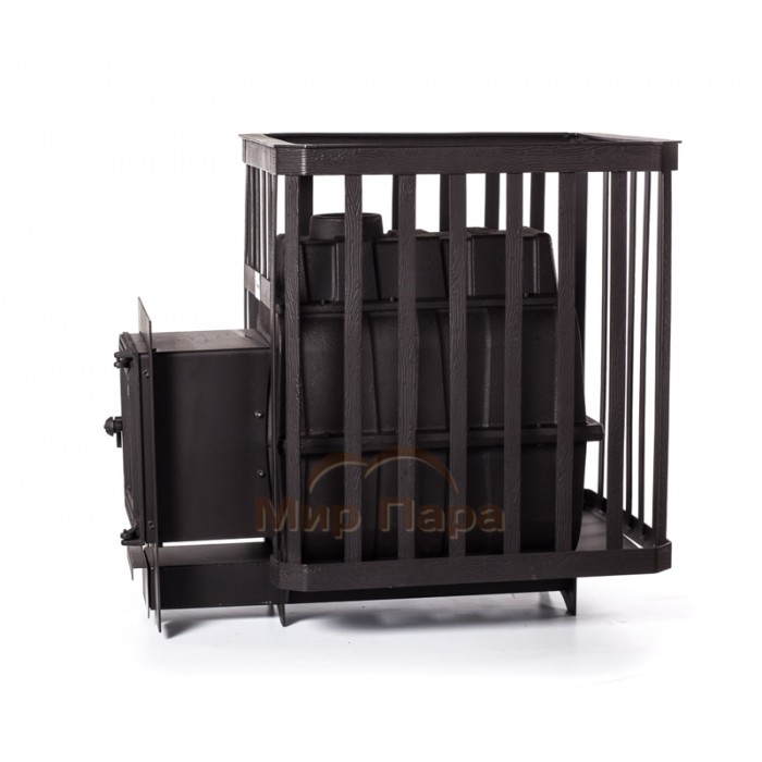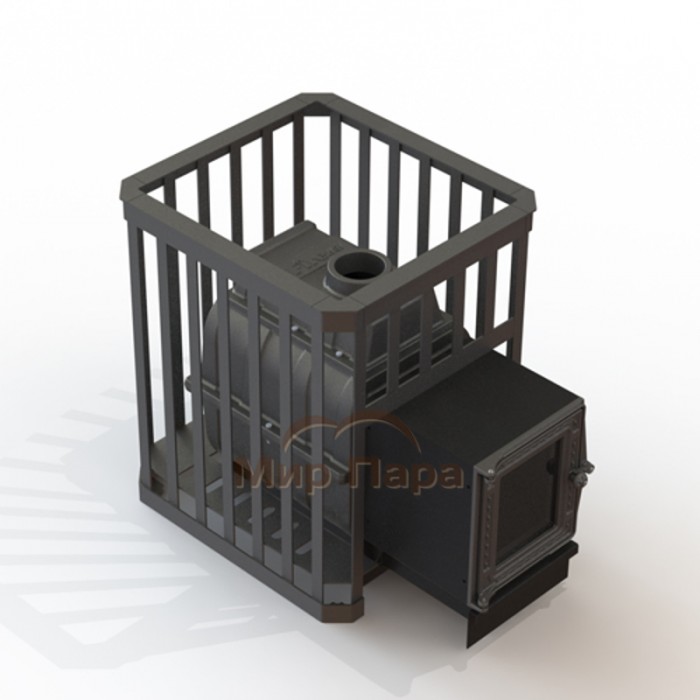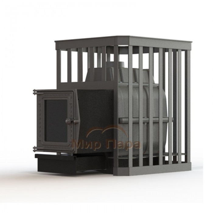 Чугунная печь для бани ПАРОВАР 24 (201) - банная печь каменка с небольшим стеклом. Сама печь, колосник и дверца выполнены из высококачественного чугуна и снабжена кованной сеткой корзины под камни. Аккумулятивный тип нагрева. Процесс горения регулируется зольным ящиком. Печь предназначена для отопления парильных помещений 14-24 м3.