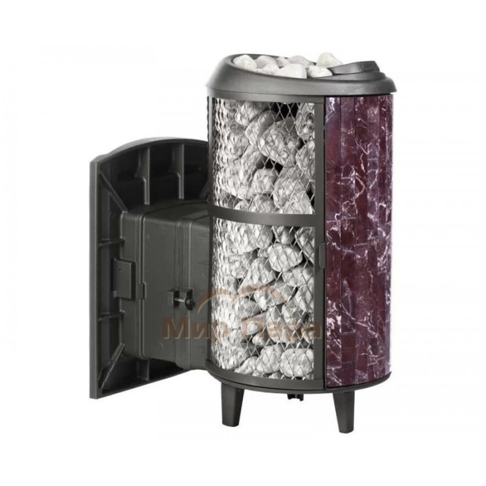 Задняя часть, отделанная натуральным камнем, размещается в парилке, а лицевая (металлическая) часть имитирует дверцу камина. Объем парильного помещения 12-24 м3.