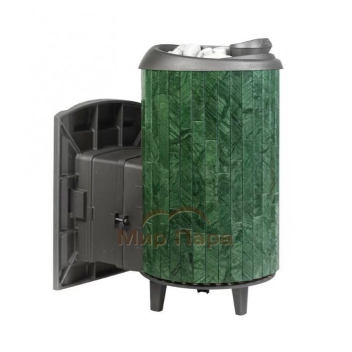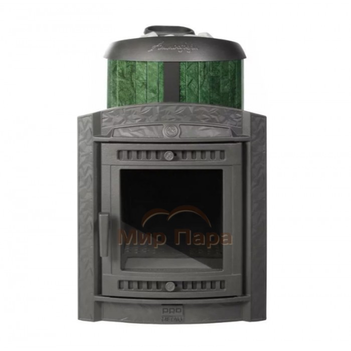 Задняя часть, отделанная натуральным камнем, размещается в парилке, а лицевая (металлическая) часть имитирует дверцу камина. Объем парильного помещения 12-24 м3.