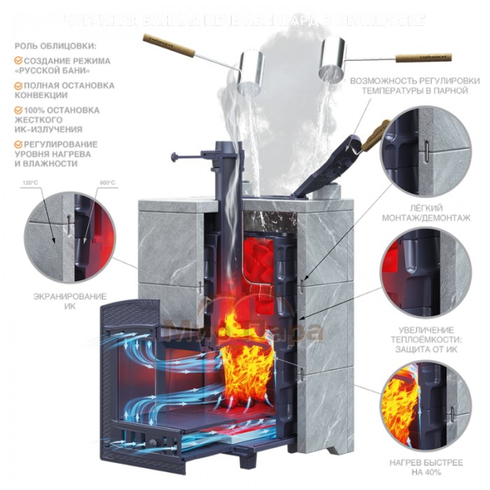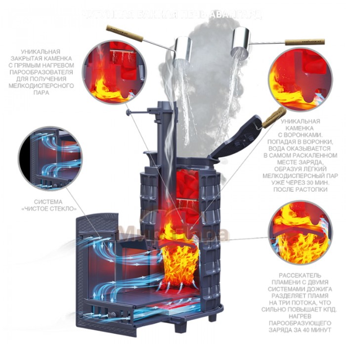 Чугунные банные печи «AVANGARD» – это высокотехнологичные изделия повышенной прочности, предназначенные для отопления парильного помещения. Печи серии «AVANGARD» предназначены для использования в парных объемом до 40 м3.