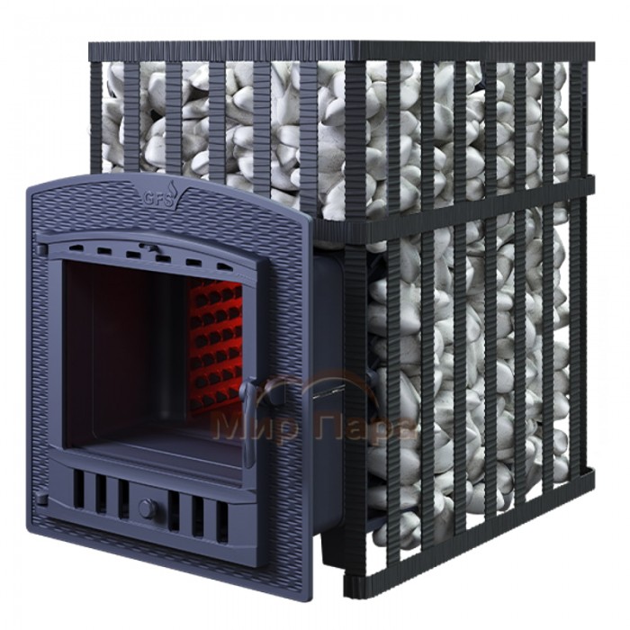 Печь GFS-3К с уникальной каменкой прямого нагрева для получения легкого мелкодисперсного пара, необходимого для режима русской бани. Благодаря инновационной конструкции, печь гарантированно входит в режим за 60 минут. Запатентованная каменка не имеющая аналогов каменка обеспечивает непревзойденную надежность и высокую теплоемкость, теплосъемные шипы по всей её поверхности, позволяют каменке быстро нагреться и долгое время удерживать тепло. Во второй камере топки с помощью потока воздуха происходит дожиг пиролизных газов, благодаря чему повышается температура горения, что увеличивает КПД печи до 90 процентов.