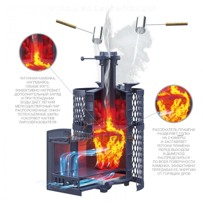 Модификация "Искандер ЗК" - это печь "Искандер" с закрытой каменкой, двумя паровыми пушками и дверцей для залповой подачи пара.