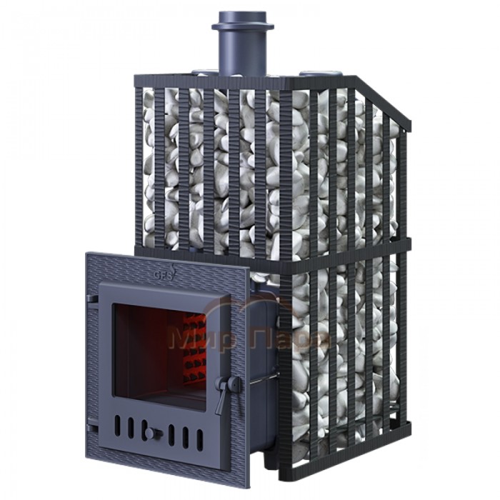 Банная печь Гефест GFS ЗК 25 (М) Ураган в сетке. Максимально приближенный вариант печи для режимов русской парной, имеющий непосредственно закрытую чугунным коробом каменку, дверцу для пара с ручкой из бука, увеличенную до 50 см чугунную стартовую трубу. Печь легко модернизируется до полноценной печи предназначенной для Русской бани путем замены стальной сетки на каменную облицовку без демонтажа дымохода.
