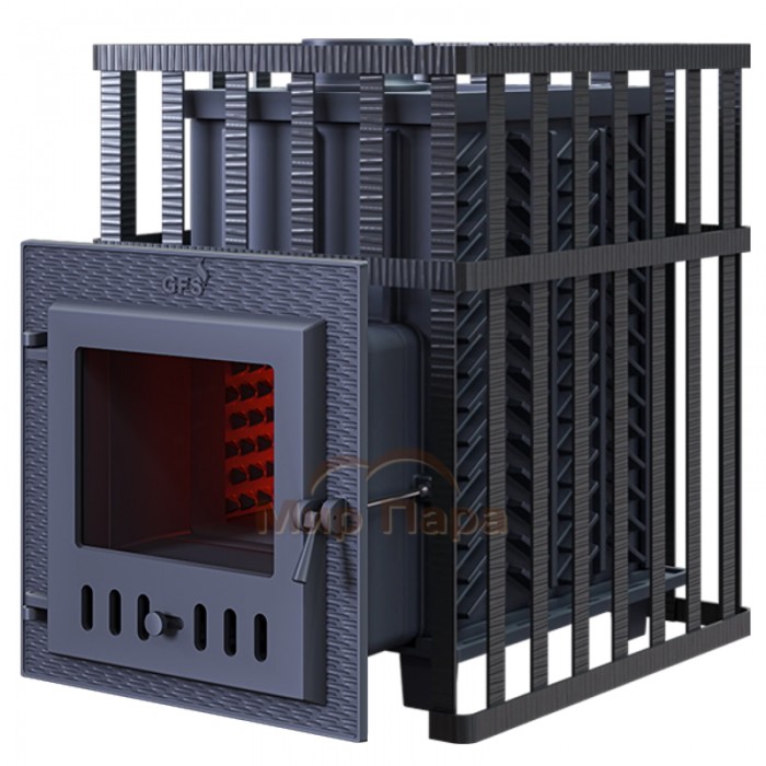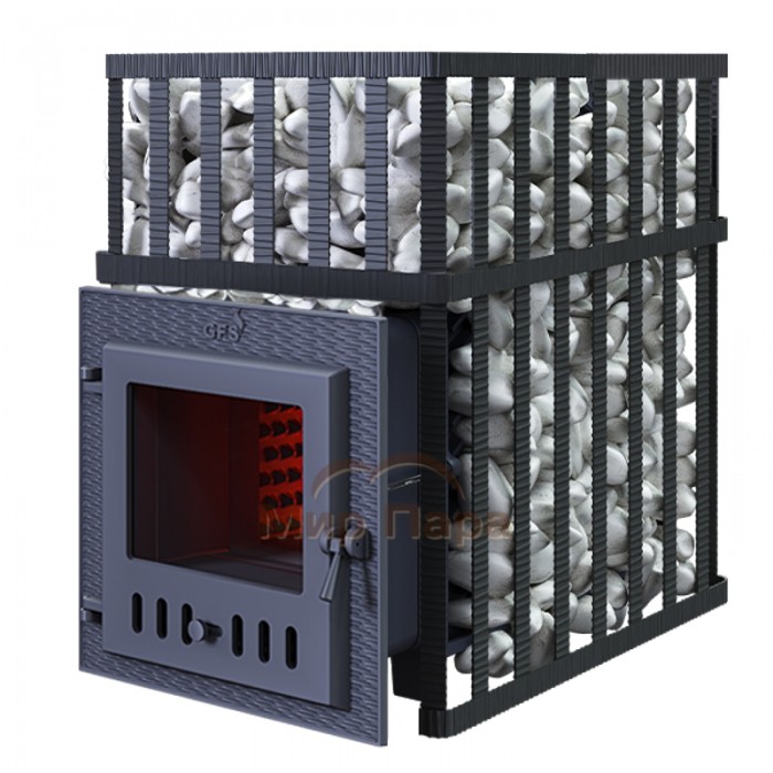 Банная печь Гефест GFS ЗК 25 (M) в сетке с усиленной каменкой большей массы, с единым углублением внутрь топки для дополнительной укладки чугунного заряда.