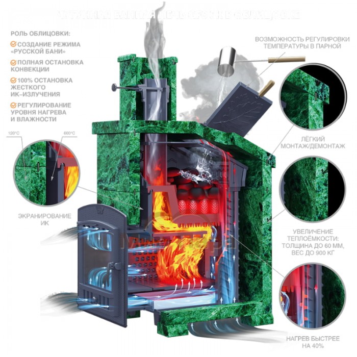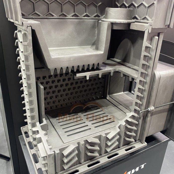 Запатентованная каменка не имеющая аналогов каменка толщиной 45 мм обеспечивает непревзойденную надежность и высокую теплоемкость, 120 теплосъемных шипов по всей её поверхности, позволяют каменке нагреться за 60 минут до 700 градусов и долгое время удерживать тепло.