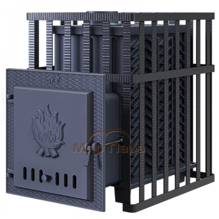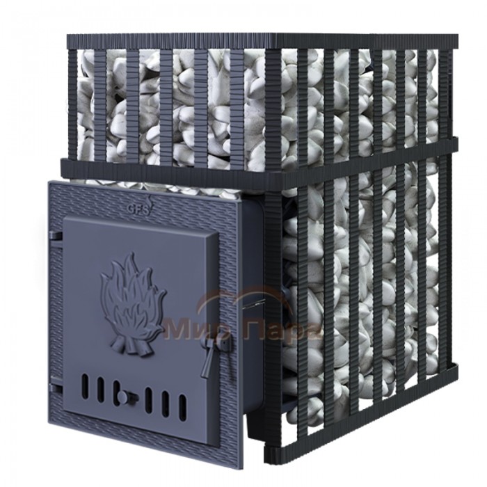 Банная печь Гефест GFS ЗК 25 в сетке с усиленной каменкой большей массы, с единым углублением внутрь топки для дополнительной укладки чугунного заряда.