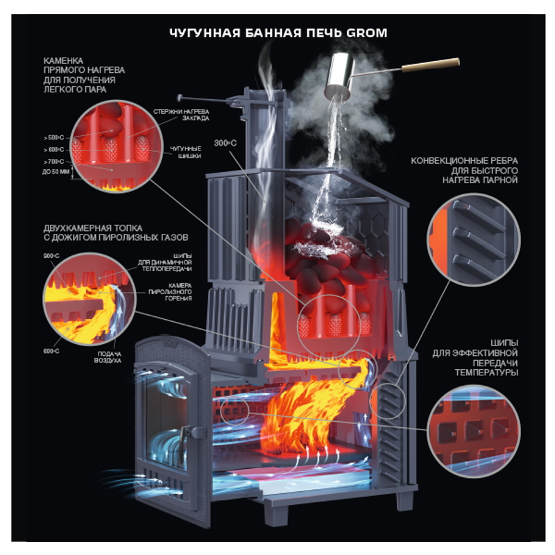 Чугунные банные печи «Гром Ураган» — это современные печи, рассчитанные на объем парных до 30 м3. Печь имеет прочную сборную конструкцию, без резьбовых и сварных соединений, детали выполнены из легированного чугуна.