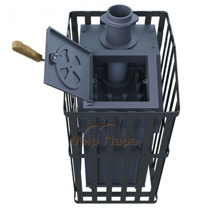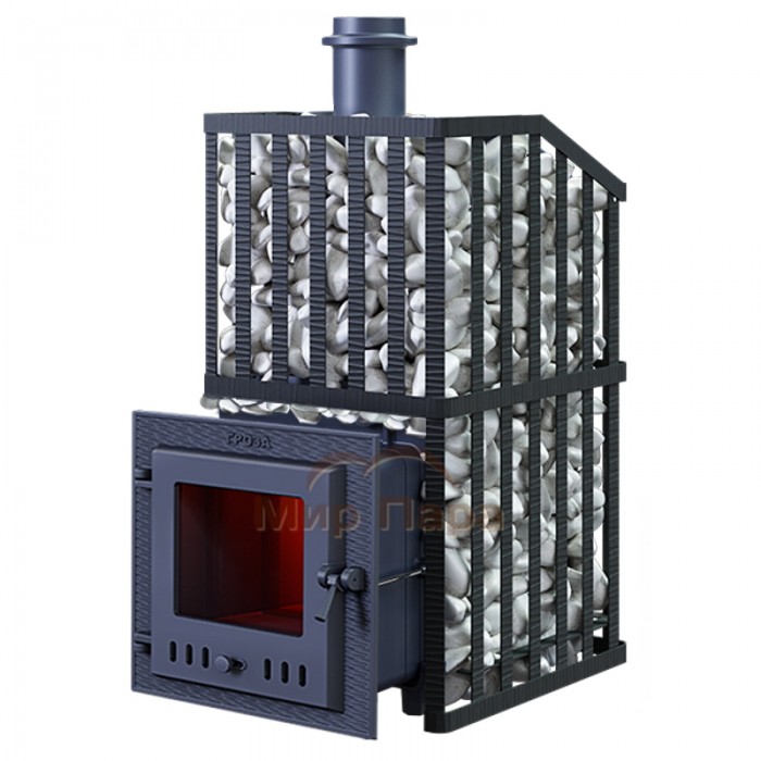 Печь для бани Гроза Ураган - расширенный комплект печи в сетке. Максимально приближенный вариант печи для режимов русской парной, имеющий непосредственно закрытую чугунным коробом каменку, дверцу для пара с ручкой из бука, увеличенную до 50см чугунную стартовую трубу.