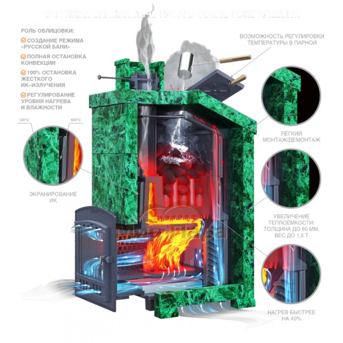 Русская баня. Печь Гром с уникальной каменкой прямого нагрева для получения легкого мелкодисперсного пара, необходимого для режима русской бани. Благодаря инновационной конструкции, печь гарантированно входит в режим за 40 минут.