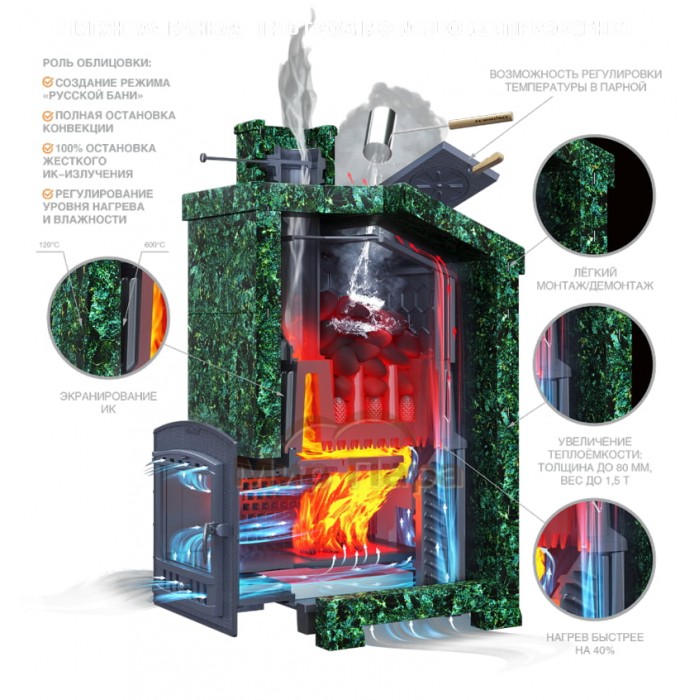 Русская баня. Печь Гром с уникальной каменкой прямого нагрева для получения легкого мелкодисперсного пара, необходимого для режима русской бани. Благодаря инновационной конструкции, печь гарантированно входит в режим за 40 минут.