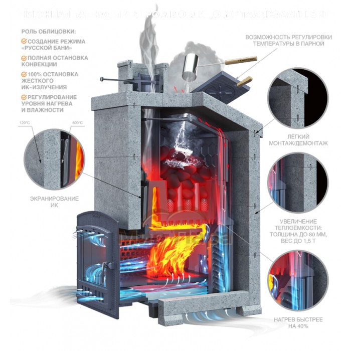 Русская баня. Печь Гром с уникальной каменкой прямого нагрева для получения легкого мелкодисперсного пара, необходимого для режима русской бани. Благодаря инновационной конструкции, печь гарантированно входит в режим за 40 минут.
